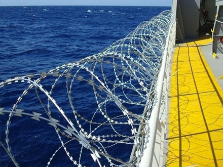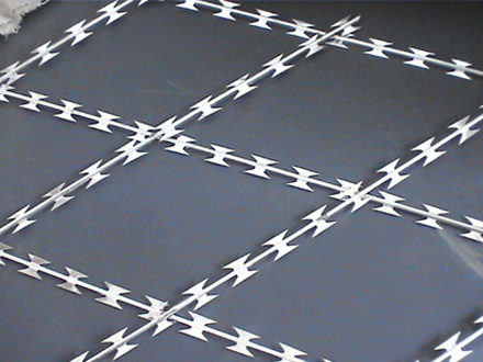 刀片刺绳也称为刀片刺丝、刀片刺网,是一种新型护栏网产品。它具有吓阻效果好、美观、施工便利,经济实用等优异特点。主要用于园林公寓,机关单位,监狱,哨所,边防等的圈禁防护。刀片刺网由热镀锌钢板或不锈钢薄板冲压出尖锐的刀片状,高张力镀锌钢丝或者不锈钢丝做芯线组合而成的阻绝器材。由于刺网造形独特不易触摸,因而能达到极好的防护隔离效果。产品的主要材质有镀锌板和不锈钢板。