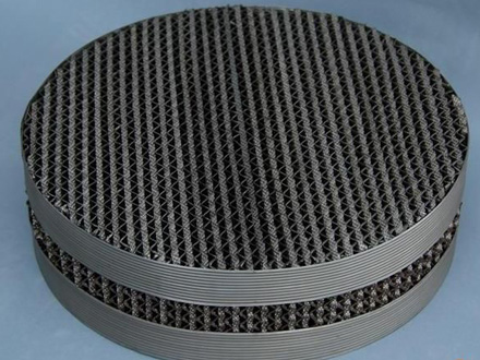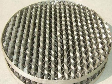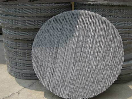 丝网波纹填料是规整填料发展的一个重要里程碑,这种填料由压成波纹的丝网片排列而成,波纹片倾角30°或45°,相邻两波纹片方向相反,在塔内填装时,上下两盘填料交错90°叠放。具有高效、压降低和通量大的优点,产品有BX、CY型,常用于难分离和热敏性物系的真空精馏,常压精馏和吸引过程。